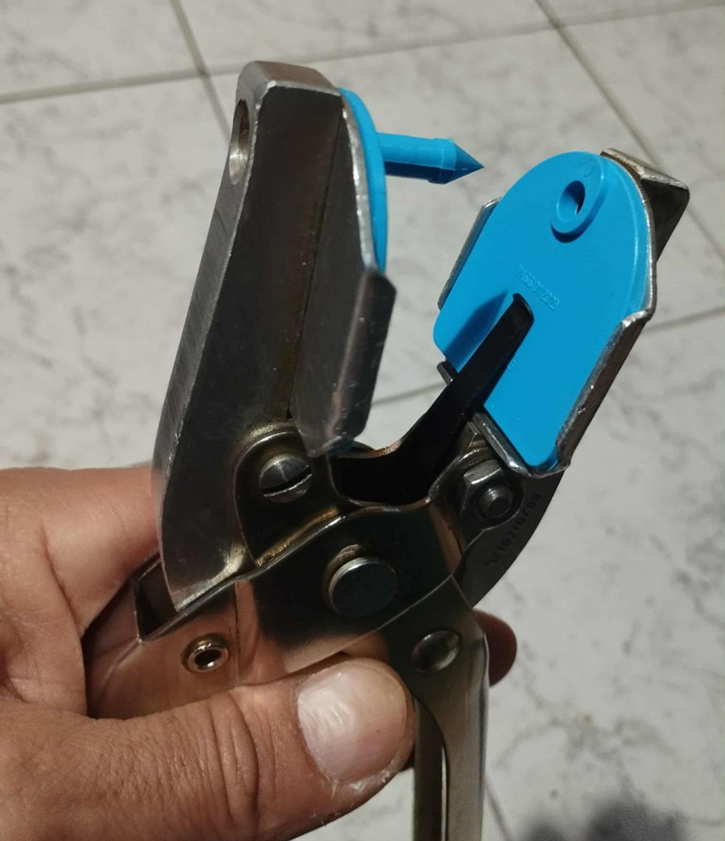 4 – Βεβαιωθείτε ότι αντιπαραβάλλονται σωστά τα μέρη της ετικέτας, περάστε το αρσενικό μέρος πάντα στην πίσω πλευρά του αυτιού, το μήκος του εφαρμοστή θα σας οδηγήσει στο σωστό βάθος ανάμεσα στα νεύρα του πτερυγίου, πιέστε και… Είστε έτοιμοι!!
